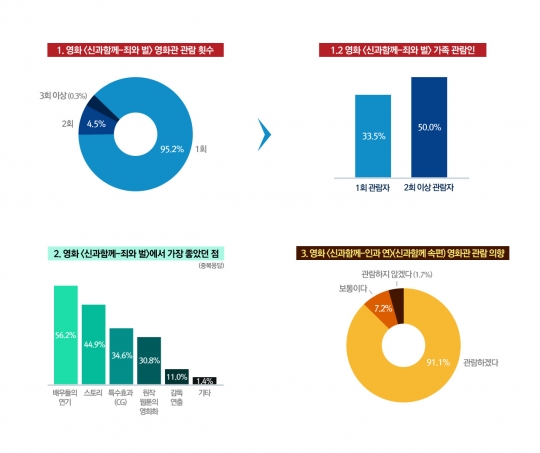 9일 '신과함께'의 배급을 맡은 롯데엔터테인먼트 측은 전 국민의 사랑을 받은 흥행 요인을 분석한 설문 조사 결과를 발표했다. 이번 설문 조사는 영화의 흥행 요인을 면밀히 분석하기 위해 여론조사전문기관인 엠브레인에 의해 지난 5~7일, 총 3일에 걸쳐 진행됐다. 조사 대상자 중 약 60%가 '신과함께'를 관람했다고 답변했다. 그 중 4.8%의 응답자는 영화를 중복관람 했다고 답변해 눈길을 끈다.