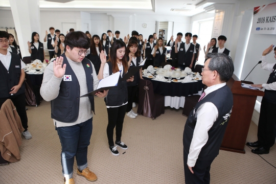 KAIST 학생들이 캄보디아와 인도네시아 봉사활동을 위한 출국에 앞서 봉사단 선서를 하고 있다. 학생들은 오는 13일부터 26일까지 현지 고등학생들을 대상으로 과학실험 교육 등을 벌인다. /KAIST