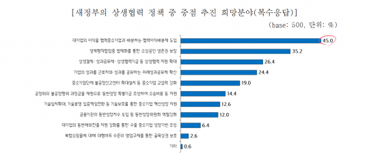 상생협력 정책 중 가장 중점을 두고 추진해야 할 것으로는 45%가 협력이익배분제를, 35.2%가 생계형 적합업종 법제화를, 26.4%가 상생결제 등 상생협력 지원 확대 등을 각각 꼽았다.