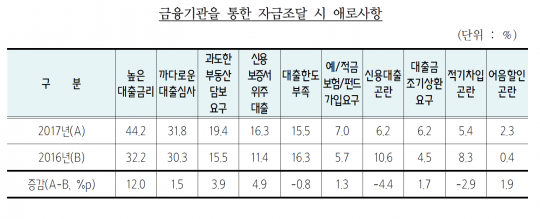 외부에서 자금을 융통하는 수단은 은행이 72.6%로 대부분을 차지하고 있는 가운데 '높은 대출금리'(44.2%), '까다로운 대출심사'(31.8%), '과도한 부동산 담보요구'(19.4%) 등이 여전히 애로사항으로 꼽혔다.