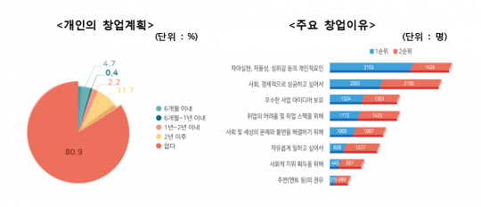 응답자의 19.1%만이 창업을 하겠다고 밝힌 가운데 11.7%는 '2년 이후 창업'을 계획하고 있는 것으로 나타났다. '창업 계획이 없다'는 80.9%였다.