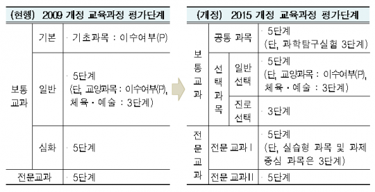개정안에는 또 2015개정교육과정 적용에 따라 신설된 진로선택과목과 과학탐구실험, 실습형·과제중심 과목에 대한 성취도 평가를 3단계(A~C)로 느슨하게 하기로 했다. 지금까지는 체육·예술교과에만 3단계 평가를, 나머지 대다수 교과는 5단계(A~E)로 평가해왔다.