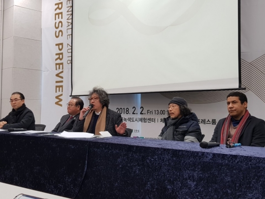 지난 2일 오후 강릉녹색도시체험센터에서는 '강원국제비엔날레2018' 개막을 앞두고 프레스프리뷰 및 기자간담회가 진행됐다. 이날 자리에는 오일주 조직위원장, 김병호 운영위원장, 홍경한 예술총감독이 참석했다.
