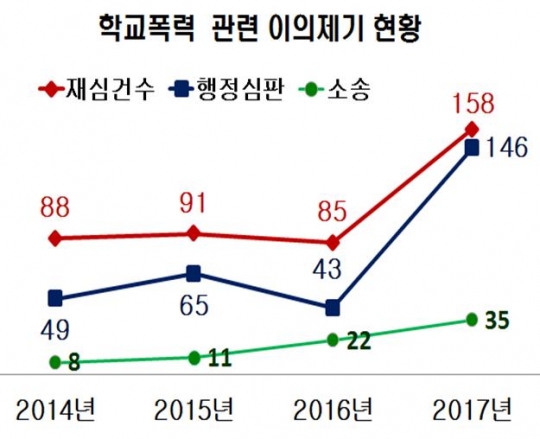 실제로 각 학교별 학교폭력대책자치위원회 심의 건수는 지난 2013년 2961건, 2014년 3182건, 2015년 3358건, 2016년 3886건으로 증가 추세다. 지난해 자체 심의에 불복해 재심을 요구한 건수는 158건이었고, 행정심판은 146건이었다. 학교폭력이 소송으로 커진 경우도 지난 2014년 8건에서 작년에 35건으로 4배 이상 증가했다.