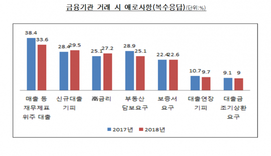 특히 응답기업의 33.6%는 금융기관과의 거래시 '매출액 등 재무제표 위주의 대출관행'이 여전하다고 답했다. '신규대출을 기피'하는 경우도 29.5%에 달했다.