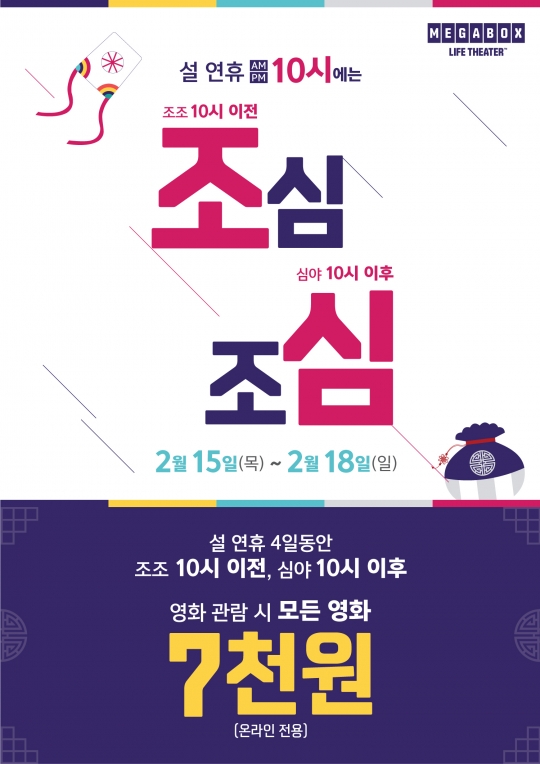 먼저, 오는 15~18일 '10시에는 조심조심 7000원' 이벤트를 진행한다. 오전 10시 이전의 조조 영화와 오후 10시 이후 심야 영화를 7000원에 인원과 횟수에 상관없이 관람할 수 있으며, 홈페이지와 모바일 앱을 통해 예매 가능하다. 특히 심야 영화의 경우 최대 3000원까지 할인 혜택이 주어진다.