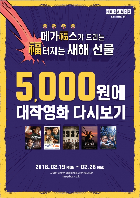 또한, 대작 영화를 5000원에 관람할 수 있는 '메가福스가 드리는 福 터지는 새해 선물' 이벤트도 19일부터 28일까지 열린다. 선정된 대작 영화는 '강철비'와 '그것만이 내 세상', '불한당', '타이타닉', '1987'이며 해당 영화는 이벤트 기간 동안 5000원에 관람 가능하다.