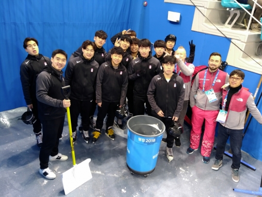 2018 평창동계올림픽 아이스하키 경기에 자원봉사 스노우보이로 활약하고 있는 광운대 아이스하키팀 선수들이 경기 중 대기하고 있다. /광운대학교
