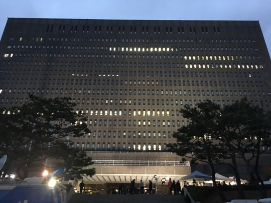 이 전 대통령은 이날 중앙지검 1001호 조사실에서 검찰과 치열한 법리 공방을 벌인다. 같은 조사실에서 박근혜 전 대통령이 '국정농단' 관련 조사를 받은 지 일 년 만이다. 청사 10층은 이미 불을 환히 밝히고 있었다.