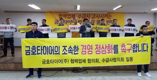 또한 금호타이어 사내외 협력업체들도 법정관리는 '공멸의 길'이라며 조속한 경영정상화 방안 마련을 통해 상생의 길을 찾자고 호소하고 있다. 그동안 금호타이어 문제를 지켜만 보아온 협력업체 대표들은 노조의 계속된 농성과 강경투쟁으로 '법정관리(워크아웃)' 가능성이 높아지면서 연쇄부도를 우려해 생존권 확보 차원에서 이날 단체 행동에 나선 것이다.