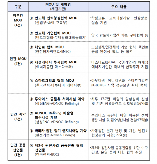 삼성엔지니어링이 30억7000만 달러 규모의 정유플랜트 건설 계약을 따냈고, SK는 후자이라 지역의 석유 저장프로젝트에 참여키로 했다. 한국전력은 UAE와 손잡고 제 3국 원전시장에 공동 진출하기로 뜻을 모았다.