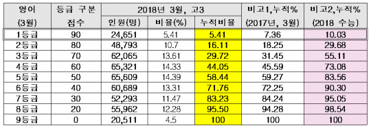 2018년 3월 모의고사 영어 영역 등급별 인원 및 누적 비율 /종로학원하늘교육