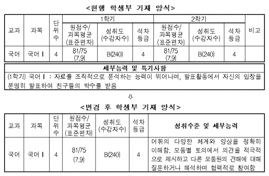 고교 학생부 기재 항목은 현행 10개에서 7개로 줄고 정규교육과정 외 교육활동의 기재가 간소화된다. 과도한 스펙쌓기와 사교육 유발 요소를 제거하고 정규교육과정 위주로 학생부를 기재하도록 한 것이 골자다.