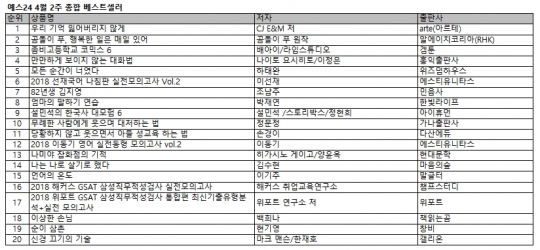 한편, SNS 인기 작가 하태완의 신간 에세이 '모든 순간이 너였다'는 지난 주 보다 두 계단 내려간 5위에 자리했고, 여전히 입소문을 타고 있는 조남주 작가의 '82년생 김지영'은 다섯 계단 하락해 7위다.