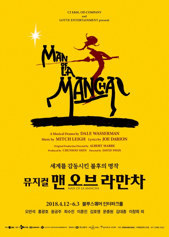 꿈을 향한 돈키호테의 강인한 집념을 뚜렷하게 드러내는 넘버들을 비롯해 대중을 사로잡는 뛰어난 연기력의 소유자 오만석과 영국 웨스트엔드까지 사로잡은 월드클래스 뮤지컬 배우 홍광호의 캐스팅 소식은 뮤지컬 팬들의 기대를 자아내기에 충분하다. 윤공주, 최수진, 이훈진, 김호영, 문종원, 이창희 등 반짝이는 별들이 함께 출연하며 4월 12일부터 6월 3일까지 블루스퀘어 인터파크홀에서 공연된다.