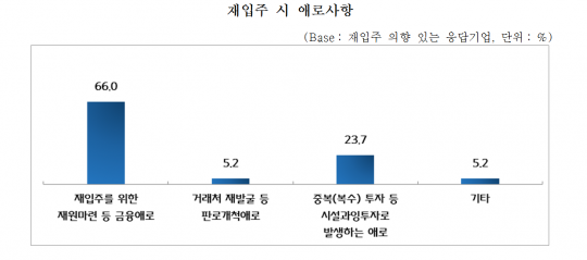 기업들이 재입주시 예상되는 애로사항으로는 '재입주를 위한 재원마련 등 금융애로'가 66%로 가장 많았고, '중복(복수) 투자 등 시설과잉투자로 발생하는 애로'(23.7%), '거래처 재발굴 등 판로개척애로'(5.2%)가 주를 이뤘다.