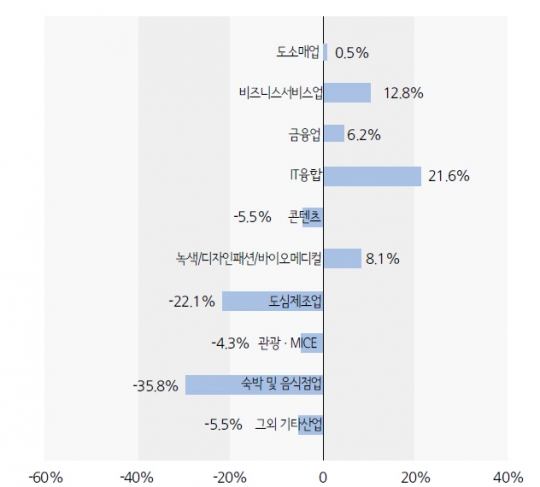 일자리 창출이 전년 동월 대비 가장 크게 줄어든 산업은 숙박·음식점업(-34%)과 도심제조업(-33%)이었다. 반면, 녹색/디자인·패션/바이오메디컬(14%), 비즈니스서비스업(13%), IT융합(4%) 산업의 일자리는 늘어났다.