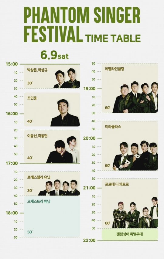 오는 6월 9일과 10일, 양일간 올림픽공원 내 88잔디마당에서 최초로 개최될 '팬텀싱어 페스티벌'의 타임테이블이 공개됐다. 24명의 '팬텀싱어' (고훈정, 손태진, 김현수, 이벼리, 박상돈, 곽동현, 강형호, 고우림, 조민규, 배두훈, 안세권, 김동현, 이충주, 조형균, 한태인, 정필립, 김주택, 박강현, 이동신, 이정수, 임정모, 박상규, 염정제, 조민웅)가 이틀에 걸쳐 14시간 동안 크로스 오버 공연을 88올림픽공원에서 선보인다.