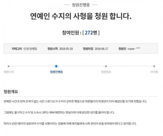지난 18일 청와대 국민청원 게시판에 '연예인 수지의 사형을 청원합니다'는 글이 올라왔다./ 청와대 홈페이지 갈무리