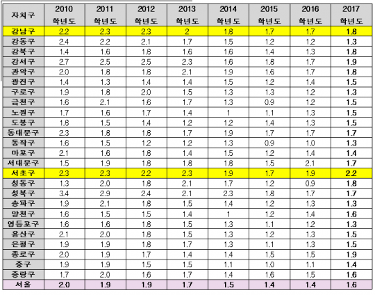 의 학업중단비율이 높았다. 대표적인 교육특구로 꼽히는 서초·강남구의 경우는 지난 2010년 이후 학업중단비율이 1.7% 이하로 떨어지지 않았다. 반면, 강동구·구로구·동작구·송파구·영등포구(1.3%)의 학업중단비율은 서울지역에서 가장 낮은 수준이었다.