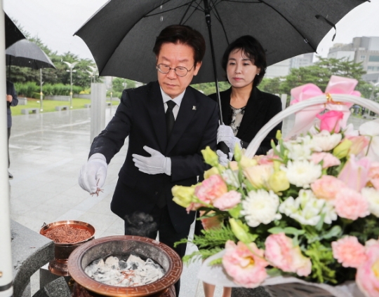 1일 오전 수원시 현충탑에서 이재명 경기도지사와 부인 김혜경 여사가 현충탑 참배를 하고 있다(사진=경기도)
