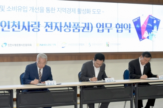 박남춘 인천시장이 31일 시청 중앙홀에서 열린 'INCHEONer CARD 발행 기념행사'에서 협약 체결을 하고 있다.