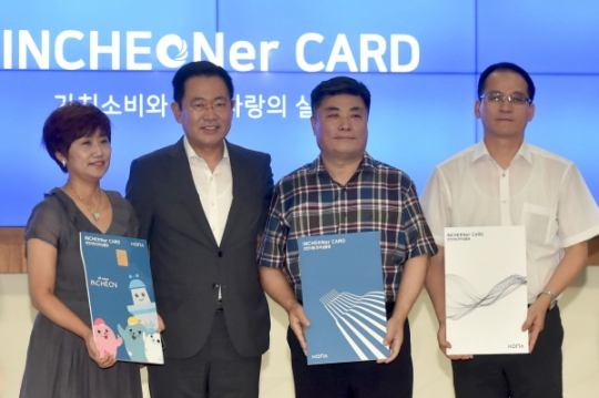 박남춘 인천시장이 31일 시청 중앙홀에서 열린 'INCHEONer CARD 발행 기념행사'에서 런칭행사 참석자에게 인처너카드 상품권을 증정한 후 기념촬영을 하고 있다.