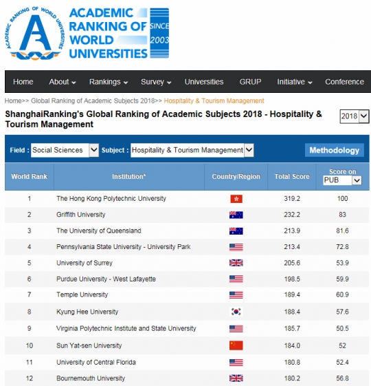 경희대가 '2018 상해교통대 세계대학 학문분야 평가'에서 호텔관광 분야 세계 8위에 올랐다. 이 평가에서 국내 종합대 중 세계 10위권에 이름을 올린 대학은 경희대가 유일하다. /경희대학교