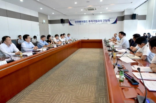 박남춘 인천시장이 14일 미추홀타워 대회의실에서 열린 '벤처펀드 운영 5년차, 관련기업과의 간담회'에서 인천기업 및 관계자들과 그간의 성과를 격려하고 발전방안에 대한 의견을 나누고 있다. (사진/인천시)