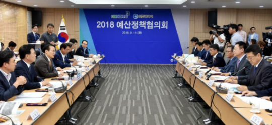 박남춘 인천시장이 지난 11일 시청 공감회의실에서 열린 '인천시·더불어민주당 예산정책협의회'에서 홍영표 더불어민주당 원내대표 및 참석자들과 '19년도 국비확보방안 및 지역현안'을 협의하고 있다. (사진/인천시)