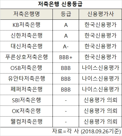 26일 금융권에 따르면 주요 저축은행이 신용등급 획득에 적극 나서고 있다. 퇴직연금 시장에 진출하려면 신용등급이 있어야 한다. KB·신한저축은행은 한국신용평가로부터 기업신용등급 A등급을 획득했고, 푸른상호저축은행은 BBB+를 받았다. 나이스 평가기준으로는 유안타·페퍼·OSB저축은행이 BBB를 획득했다.