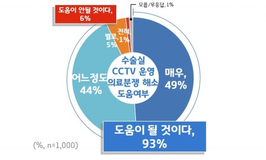 반면 우려되는 점은 '관리 소홀에 따른 수술영상 유출 및 개인정보 침해'(42%), '의사의 소극적 의료행위'(25%) 순으로 나타났다. CCTV 설치 운영을 민간병원까지 확대해야 하는가에 대한 물음에는 87%(매우 51%, 대체로 36%)가 긍정적 답변을 했다.