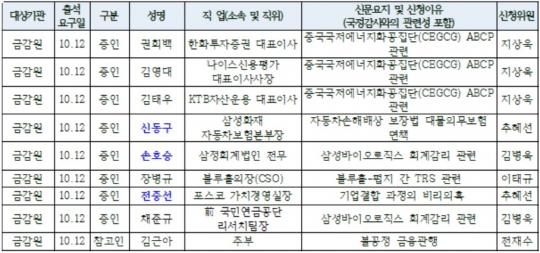 삼성바이오로직스 회계감리와 관련해서는 손호승 삼정회계법인 전무와 채준규 전 국민연금공단 리서치팀장이 증인으로 국감에 나온다. 금감원은 앞서 금감원은 삼성바이오로직스의 분식회계 혐의에 대한 감리결과를 유보한 바 있다. 금감원은 현재 금융위의 요청으로 삼성바이오로직스의 재감리를 진행 중이다.