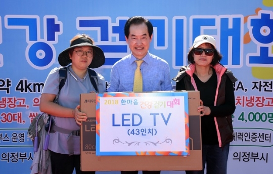 의정부시민 한마음 걷기 대축제에 참가한 시민들이 경품에 당첨돼 LED TV를 경품으로 안병용 의정부시장이 증정하고 있다.사진/의정부시