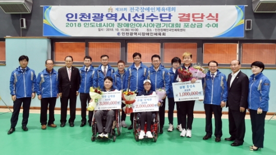 박남춘 인천광역시장이 지난 16일 장애인 국민체육센터에서 열린 '제38회 전국장애인체육대회 인천광역시선수단 결단식'에서 2018 인도네시아 장애인아시아경기대회 포상금을 전달하고 있다.