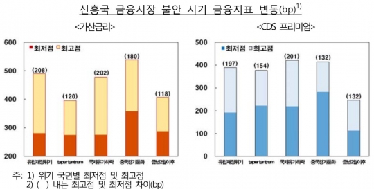 다만 보고서는 이번 신흥국 금융불안은 글로벌 금융위기 이후 몇 차례 금융불안 때와 비교하면 금융지표 변동성이 작다고 평가했다. 이는 지난 2013년 테이퍼 탠트럼(긴축발작) 때와 달리 미국의 금리인상이 이미 예견돼 장기적인 정책 불확실성이 작았기 때문이다. 또 중국 실물과 금융경제상황이 크게 악화하지 않은 점도 신흥국 금융발안의 확산을 제한하는 데 기여했다.