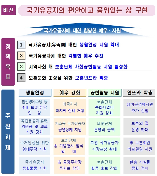 서울시가 국가유공자에 대한 예우를 갖추기 위해 '4대 보훈수당'을 100% 인상하는 등 처우 개선에 나선다. 오는 2021년까지 2083억원을 투입, 4개 분야 16개 과제를 추진한다.