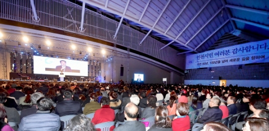박남춘 인천시장이 지난달 30일 송도 컨벤시아에서 열린 '제20회 심청효행대상 시상식'에서 수상자들과 기념촬영을 하고 있다. (사진/인천시)
