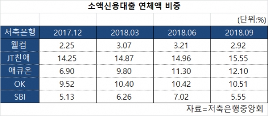 반면 소액신용대출 연체액 비중은 대체로 증가했다. 올해 9월 말 기준 공시자료에 따르면 JT친애저축은행 15.55%, 애큐온저축은행 12.0%, OK저축은행 10.51%을 기록해 5대 저축은행중 3곳이 10%가 넘는 연체율을 기록했다. 급전이 필요해 소액신용대출을 이용한 저신용자를 중심으로 부실위험이 증가하고 있는 셈이다.