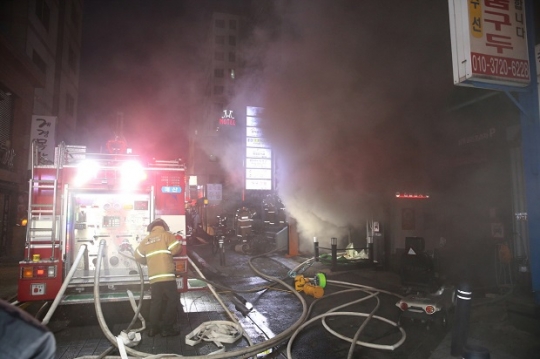 경기도 수원의 골든플라자 화재 진압 현장 .사진/경기도