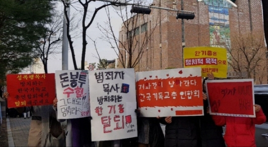 세계여성인권위원회 서울경기북부지부 회원들이 한기총 소속 교회 앞에서 목사들의 성범죄를 규탄하는 시위를 벌이고 있다. (사진/세계여성인권위원회)