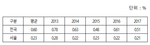 서울시의 주민참여예산 반영률은 지난 2013년 0.28%에서 2014년 0.22%로 감소했다. 2015년 0.23%로 전년도에 비해 0.01%포인트 소폭 증가했다가 2016년 0.22%, 2017년 0.21%로 꾸준히 감소하는 추세다.