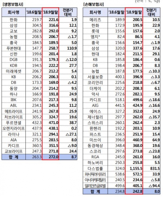 생명보험회사의 RBC비율은 272.0%로 전분기 대비 8.7%포인트 올랐고 손해보험회사의 RBC비율은 242.8%로 8.0%포인트 상승했다.