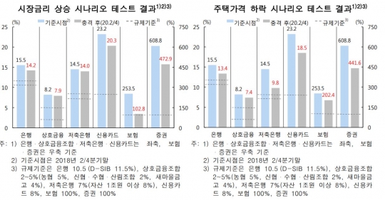 은행, 상호금융 등은 금리상승이나 주택가격 하락 충격으로 자본비율이 떨어지긴 했으나 큰 변화가 나타나진 않았다. 은행은 시장금리 상승 시 자본비율이 15.5%에서 14.2%로 떨어졌고 주택가격 하락 시에는 13.4%로 내려갔다. 신용카드사도 23.2%에서 각 20.3%, 18.5%로 하락했고 상호금융은 8.2%에서 각 7.9%, 7.4%로 떨어졌다.