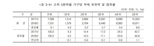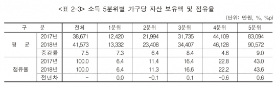 이 가운데 소득 5분위가구 자산은 전체의 43.6%, 소득 1분위는 6.4%를 점유했다. 5분위가구 자산은 전년 8억3094만원에서 9억572만원으로 9.0% 증가했지만 1분위 자산 증감률은 7.3%로 평균 증감률(7.5%)을 넘지 못했다.