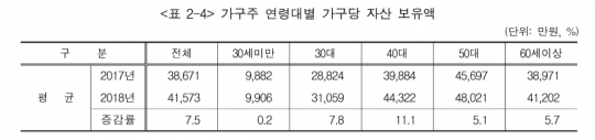 가구주 연령대별로는 40대의 자산이 가장 많이 증가했다. 40대 평균 자산은 전년 3억884만원에서 11.1% 증가한 4억4322만원을 기록했다.
