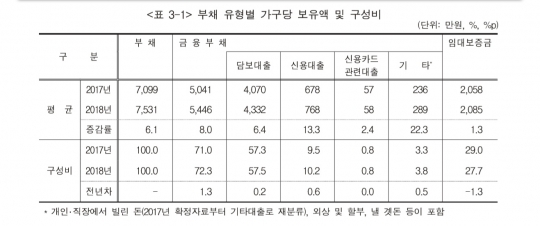 부채도 3월 말 기준 가구 평균 7531만원으로 전년 7099만원에 비해 6.1% 늘었다. 부채는 금융부채 72.3%(5446만원), 임대보증금 27.7%(2085만원)다.