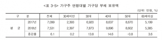 가구주 연령대별로는 40대 가구 부채가 9896만원으로 가장 많다. 특히 전년 8637만원에 비해 14.6% 늘었다. 이어 50대 부채는 평균 8602만원, 30대는 7873만원 순이었다.