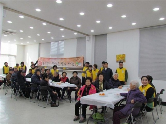 신천지자원봉사단 서울동부지부(지부장 정천석)가는 동지를 맞아 중계 104 마을복지회관에서 어르신들께 동지팥죽을 대접하고 있다. 사진/서울야고보