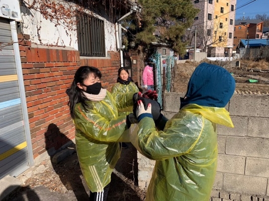 고양시신도동종합복지회관, '사랑의 블랙산타' 나눔 실천 연탄나르기 행사를 진행중인 지역 태권도.음악학원 원생들.사진/고양시